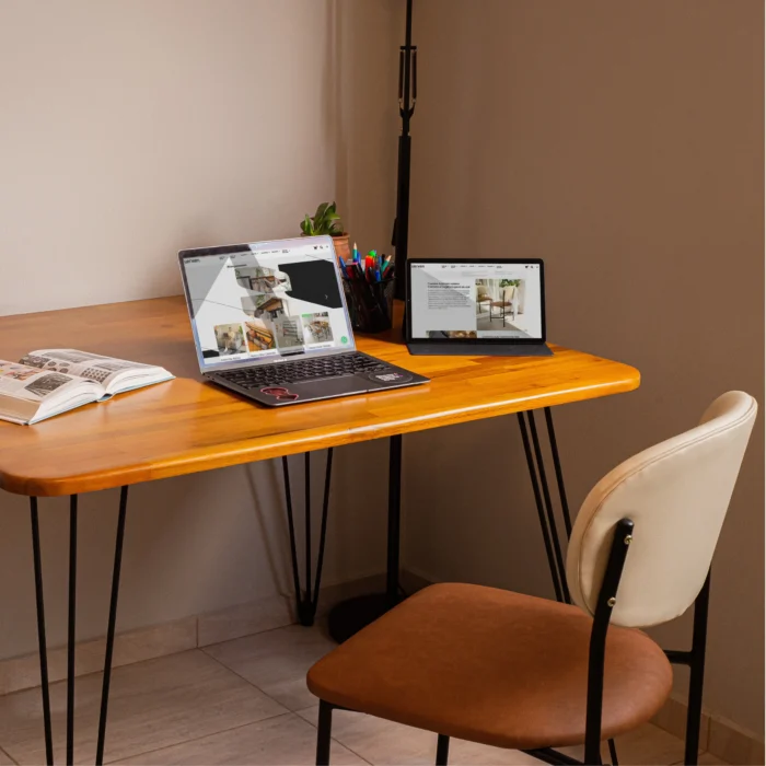 Seu tampo em madeira maciça de eucalipto traz a beleza natural da madeira, enquanto os pés em ferro maciço com pintura eletrostática garantem estrutura firme e visual contemporâneo.